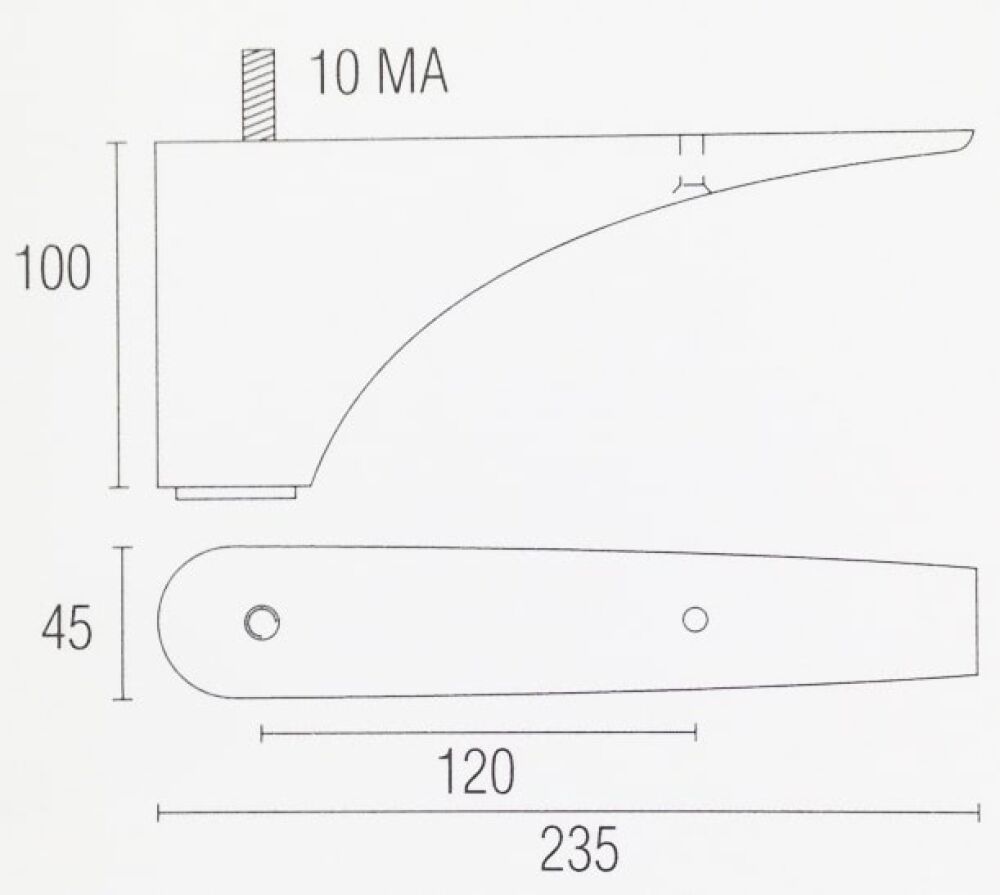 De poot heeft een hoogte van 100mm de totale lengte is 235mm de bevestiging is een M10 bout